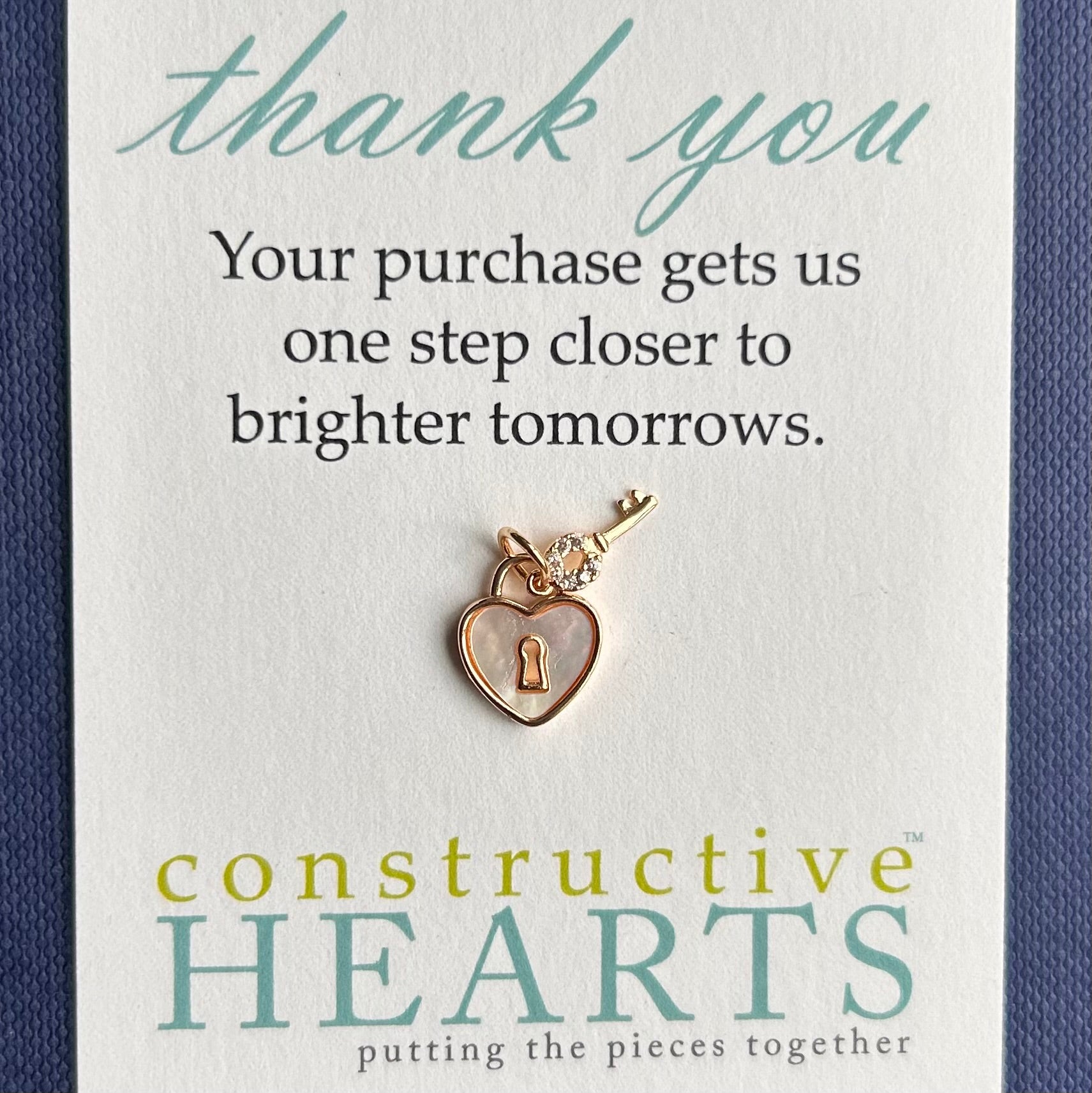Delicate heart lock with mother of pearl inlay, and small key with CZ detail. Gold filled.