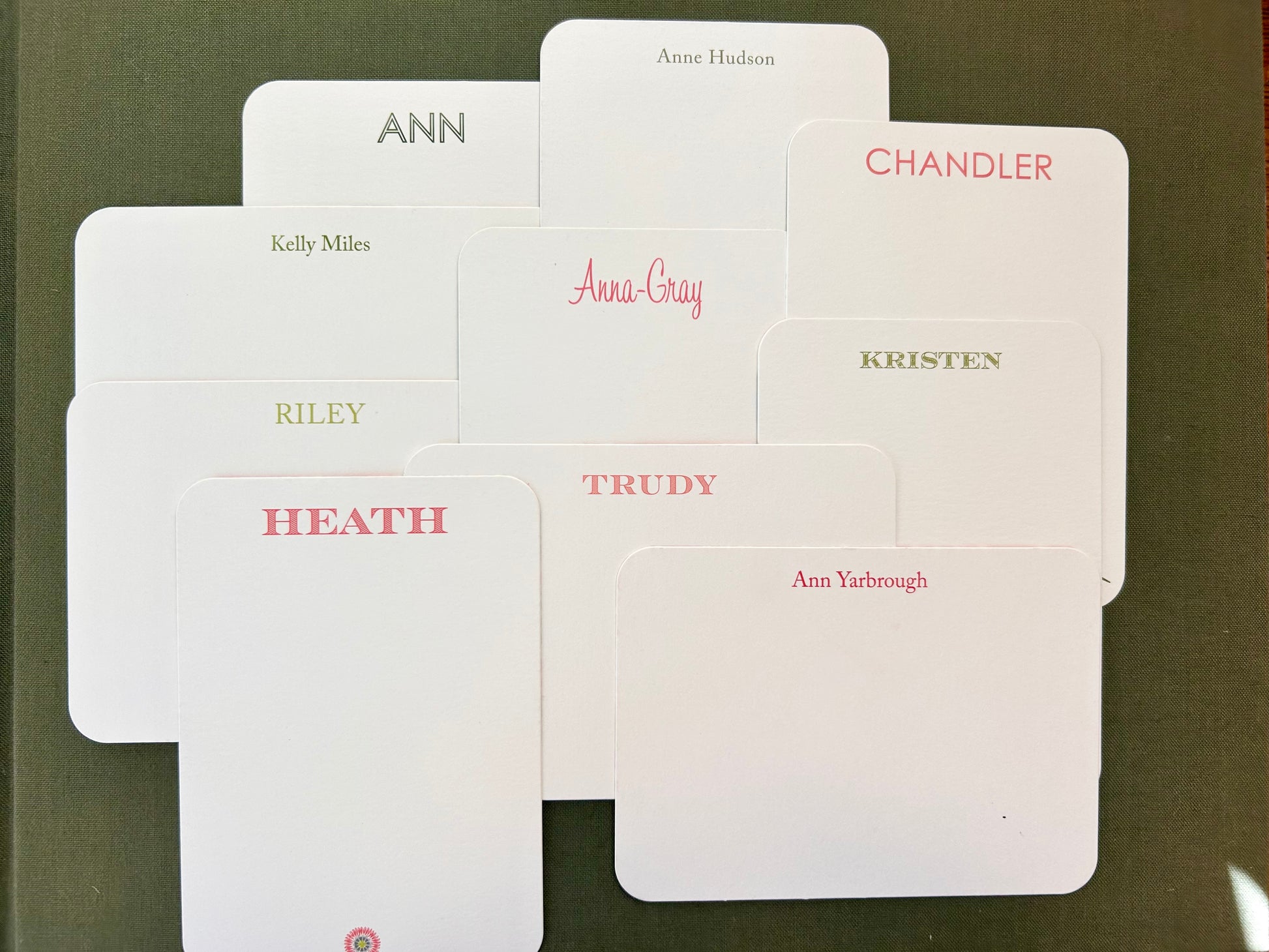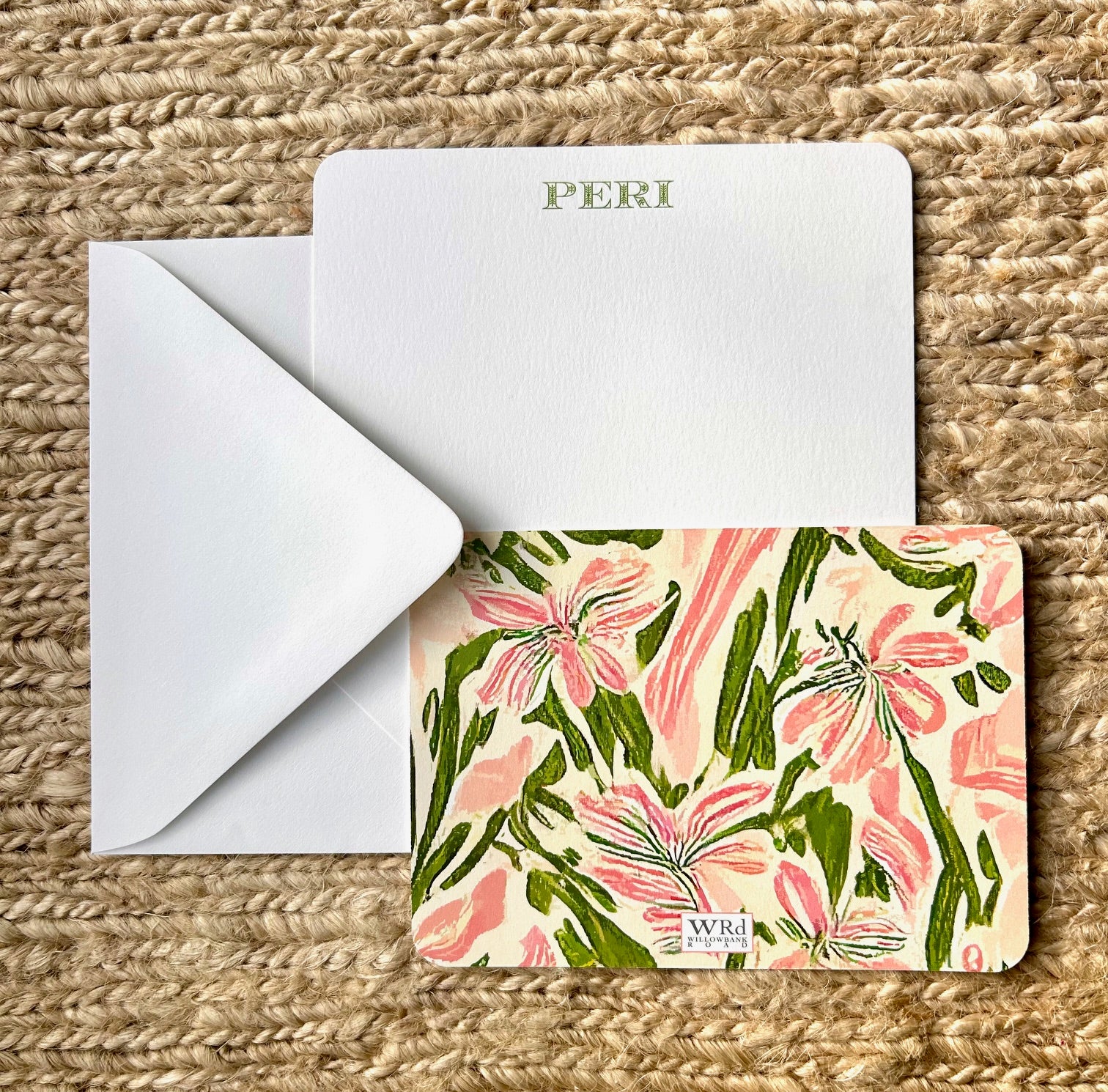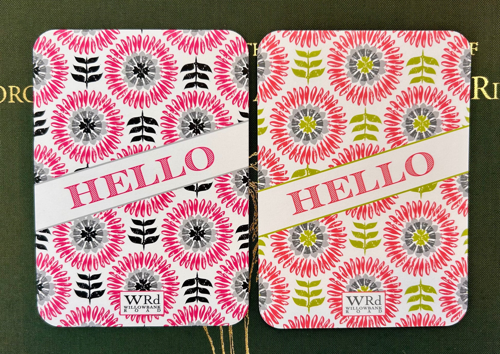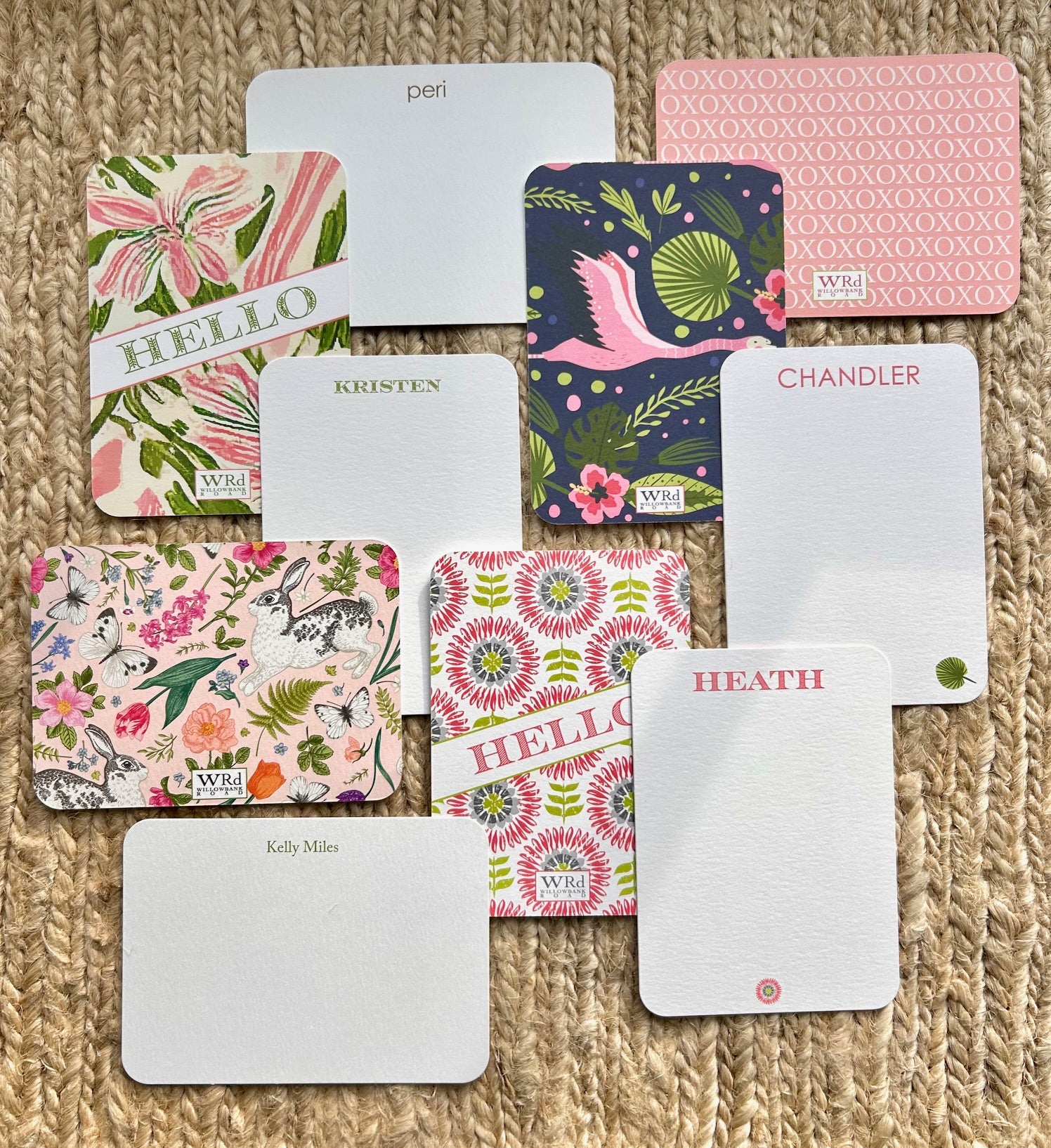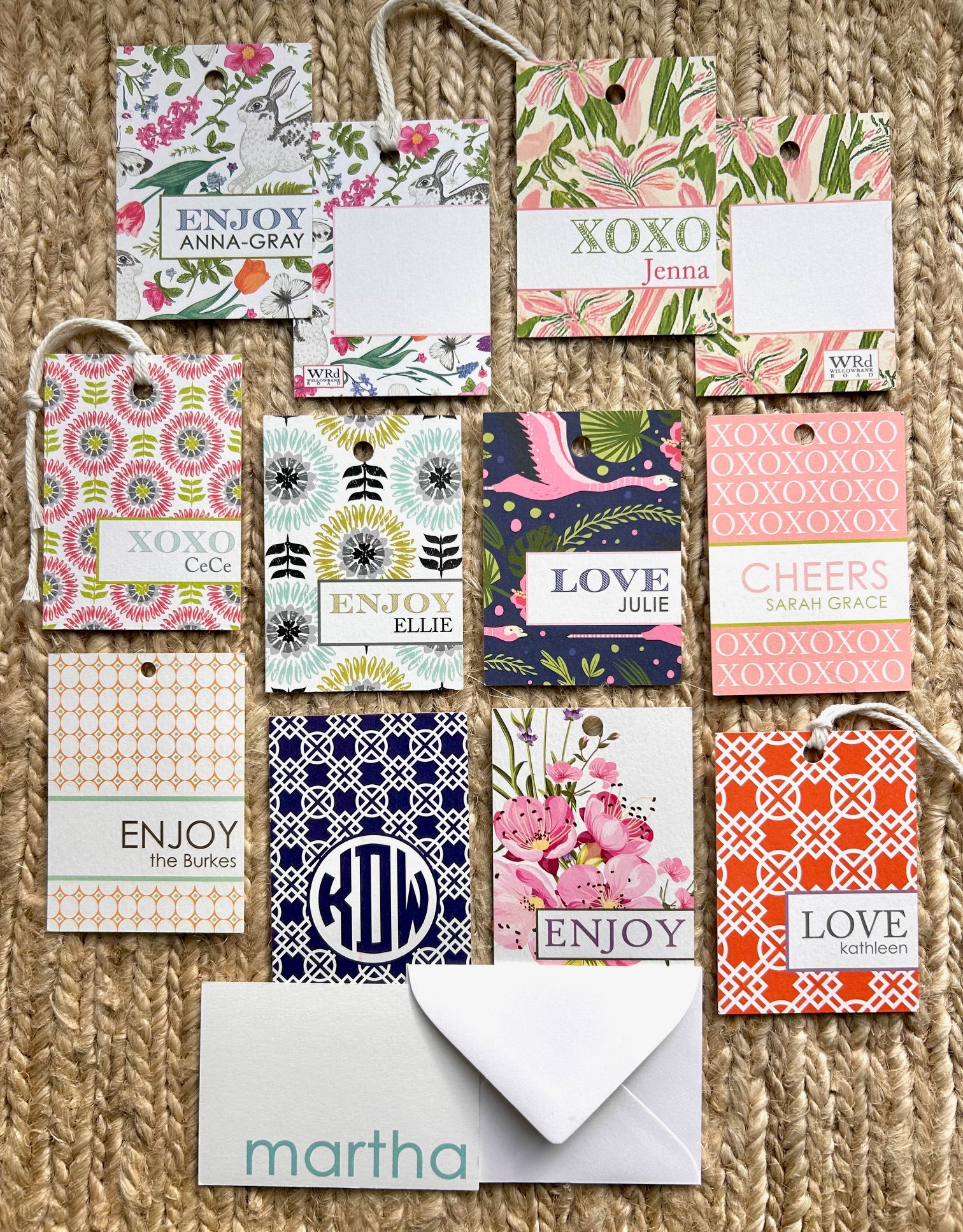 This versatile pattern works beautifully across our entire product lineup: flat and folded notes, notepads in multiple sizes, gift tags, enclosure cards with matching envelopes, laminated ribbon-adorned bookmarks, luggage tags, and personalized invitations.